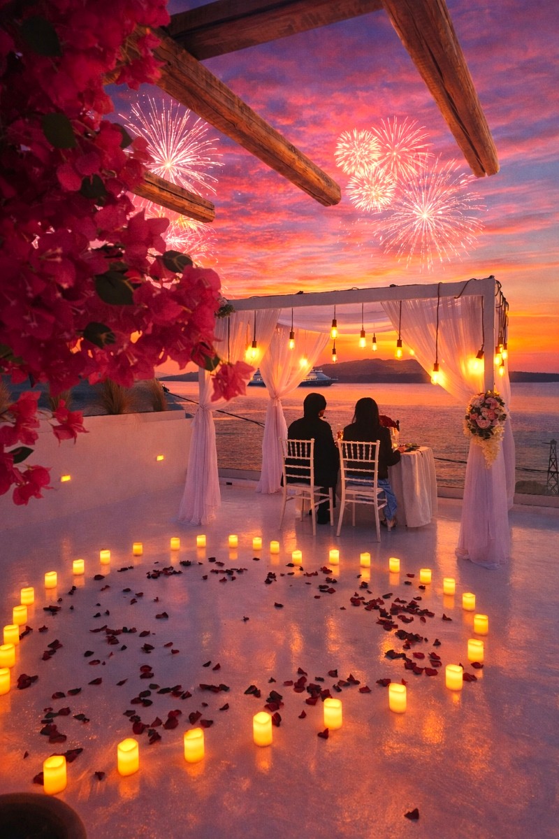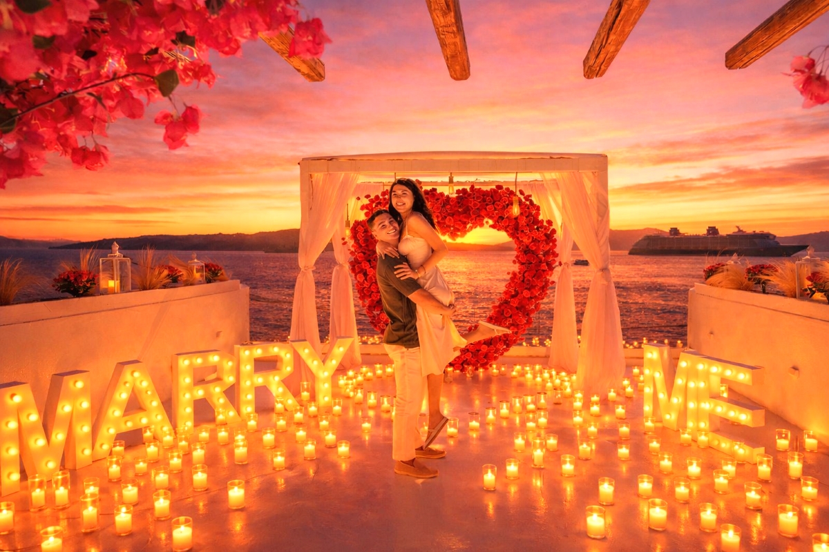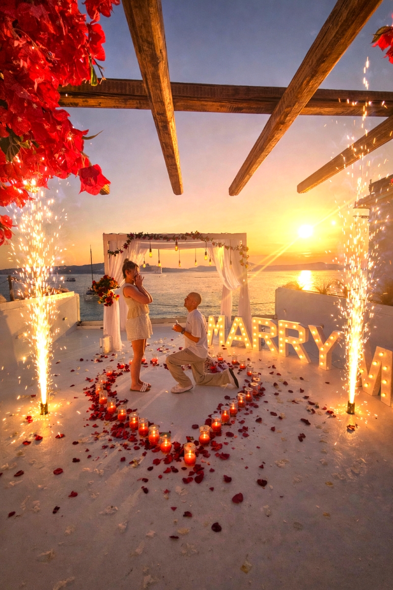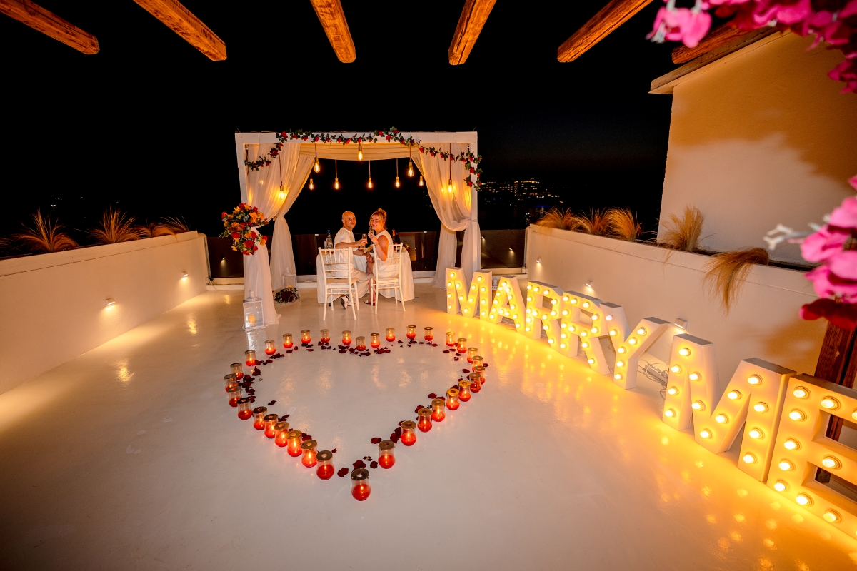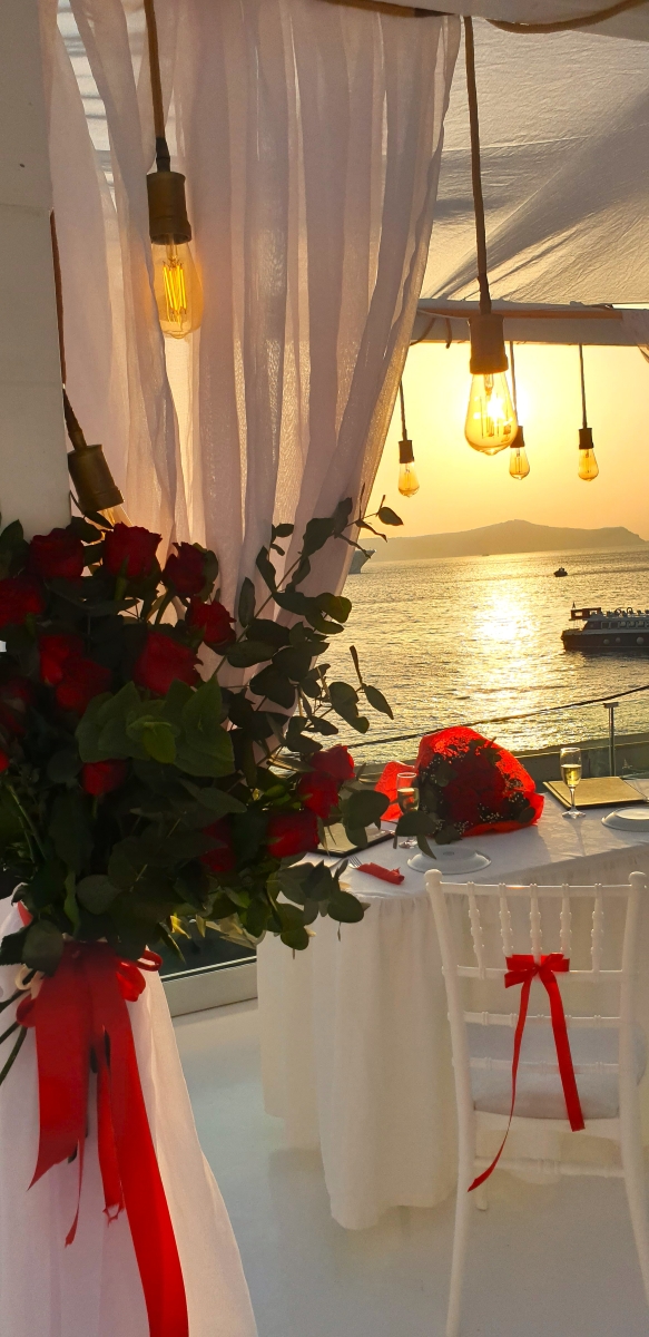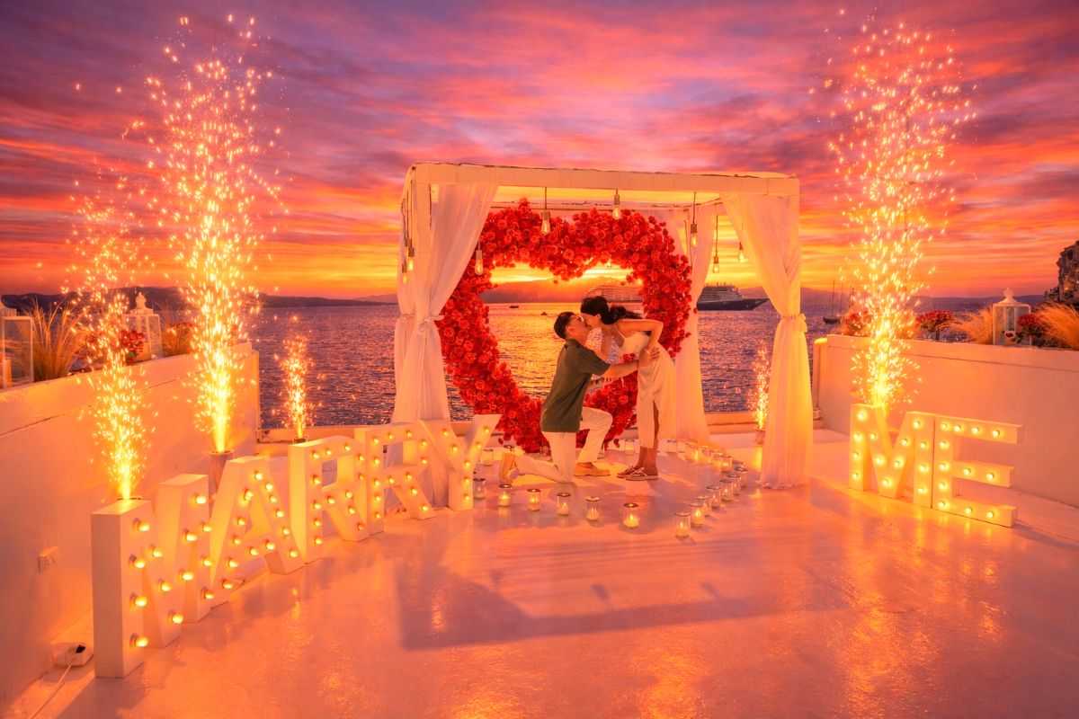 The one thing that says Santorini most of all is the sunset. Plan a magical evening you and your partner will always cherish for the rest of your lives! The private dinner Santorini proposal package is a great choice if you prefer a relaxed and delicious Santorini Proposal. What makes this package different is that we have the freedom to be creative and decorate the private venue any way you like! In order to have the private dinner, We will rent the popular wedding venue and add on any extra services you like. The most popular extra services are: Flowers, Lightings (Vintage Bulbs) and Fountain Fireworks! Venue & Meals used to be extra because prices differ depending on your preferences and this way you are free to choose anything you like! But with this All-Inclusive Package, You have all you need and the option to add even more!