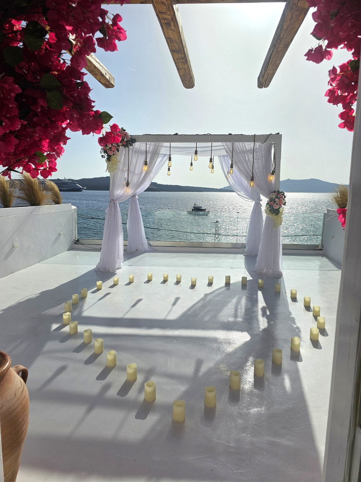 Santorini Proposal Venue Aion is the newest and most requested Wedding proposal spot of Santorini. Firstly, It’s located in the heart of Santorini Fira Port, Where you can see the famous sunsets romantic views.