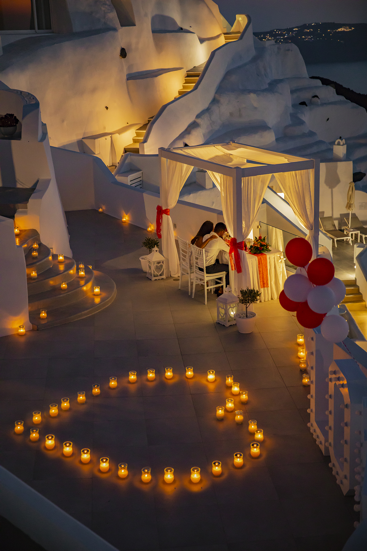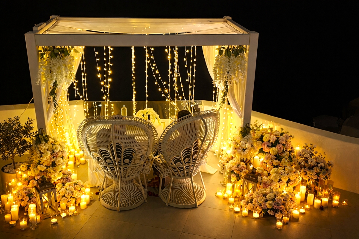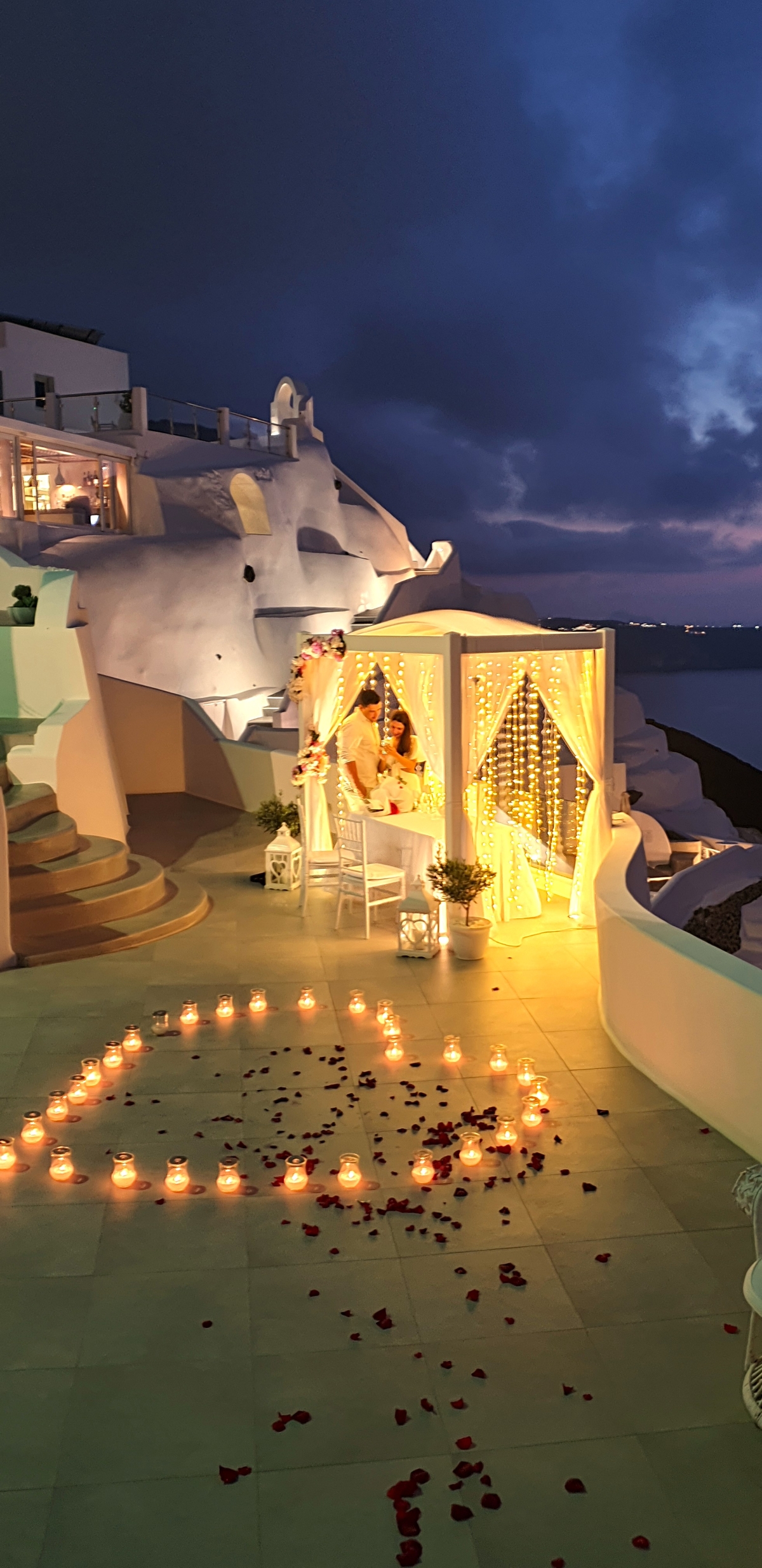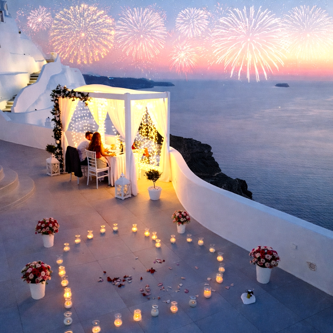 The one thing that says Santorini most of all is the sunset. Plan a magical evening you and your partner will always cherish for the rest of your lives! The private dinner Santorini proposal package is a great choice if you prefer a relaxed and delicious Santorini Proposal. What makes this package different is that we have the freedom to be creative and decorate the private venue any way you like! In order to have the private dinner, We will rent the popular wedding venue and add on any extra services you like. The most popular extra services are: Flowers, Lightings (Vintage Bulbs) and Fountain Fireworks! Venue & Meals used to be extra because prices differ depending on your preferences and this way you are free to choose anything you like! But with this All-Inclusive Package, You have all you need and the option to add even more!