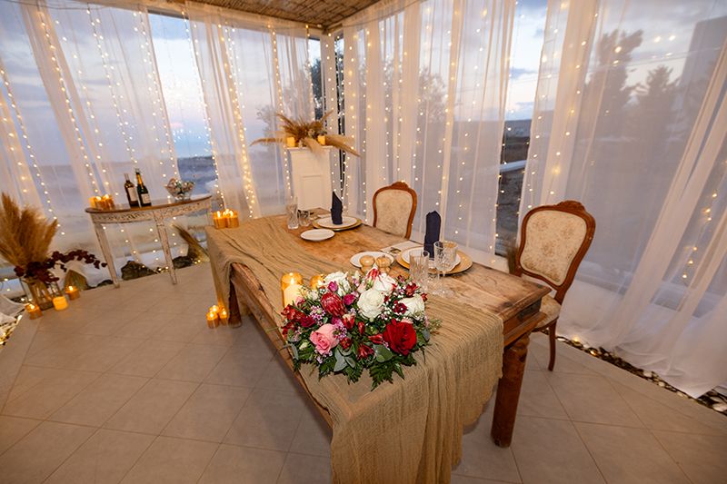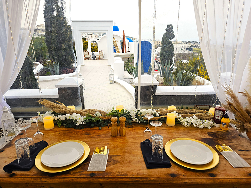 Santorini private dinner proposal is All inclusive Santorini proposal package the ultimate relaxing and romantic proposal package. Propose at the elegant Saint Nicholas private venue with fully decorations of your choice and enjoy a tasty dinner.