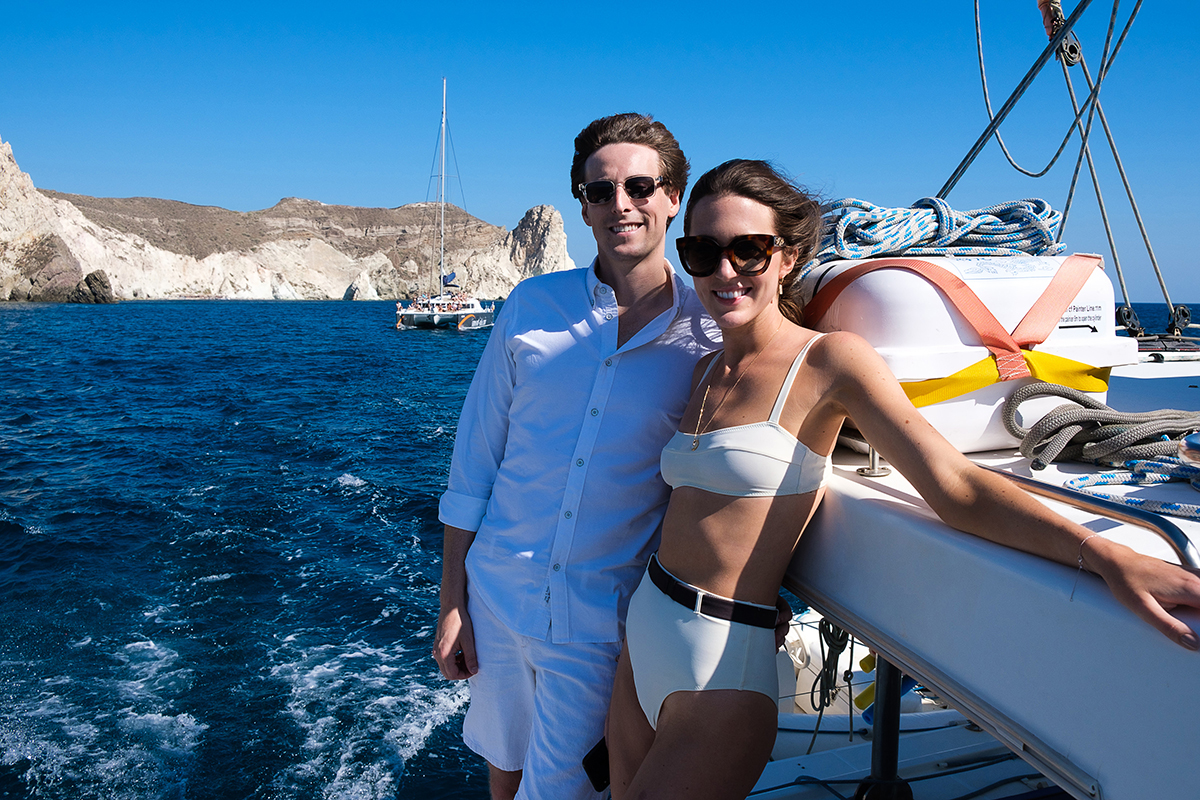 So he/she is very excited and looking forward to the cruise, to get to the boat we’ll have our driver pick you up from your hotel and take you to the port where you will meet your skipper and the crew and they will greet you with a big smile on their faces as they always do, The cruise will be going smoothly and we’ll visit many of the highlights of Santorini.