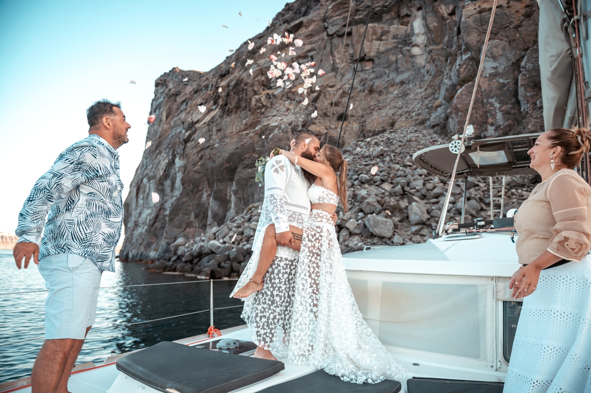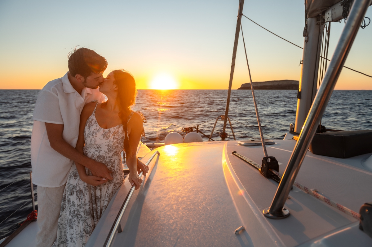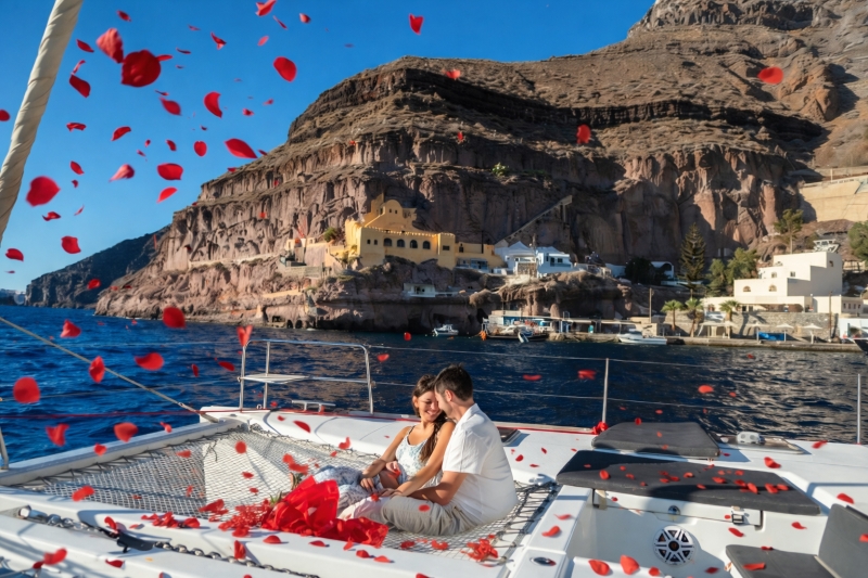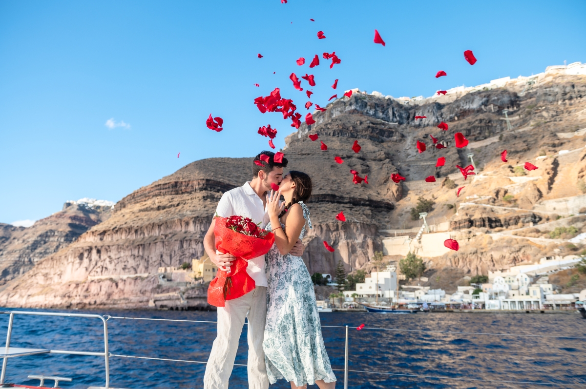 Santorini Yacht proposals is All inclusive proposal package on luxury yacht and the most popular idea to propose during a romantick sunset cruise on Catamaran yacht.