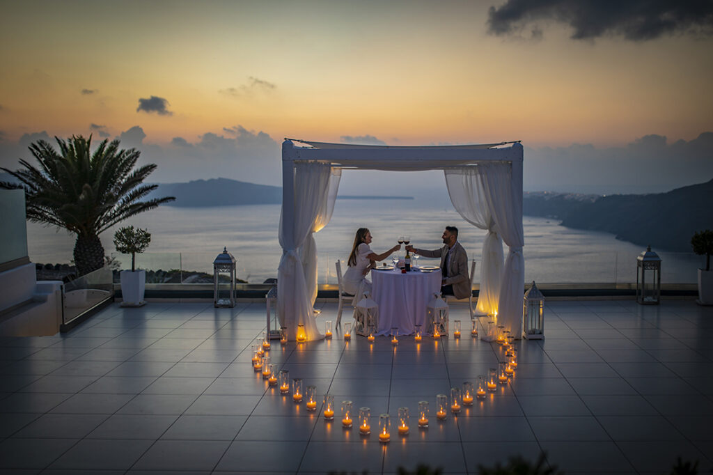Le Ciel Santorini is a Proposal & Event Venue. You can find the venue on the top level of the Santorini Caldera in Imerovigli. The view of Santorini, the volcano, and perhaps the most magical sunset in Greece, is magnificent. Le Ciel boasts a large terrace to host your Romantic Proposal Ceremony.